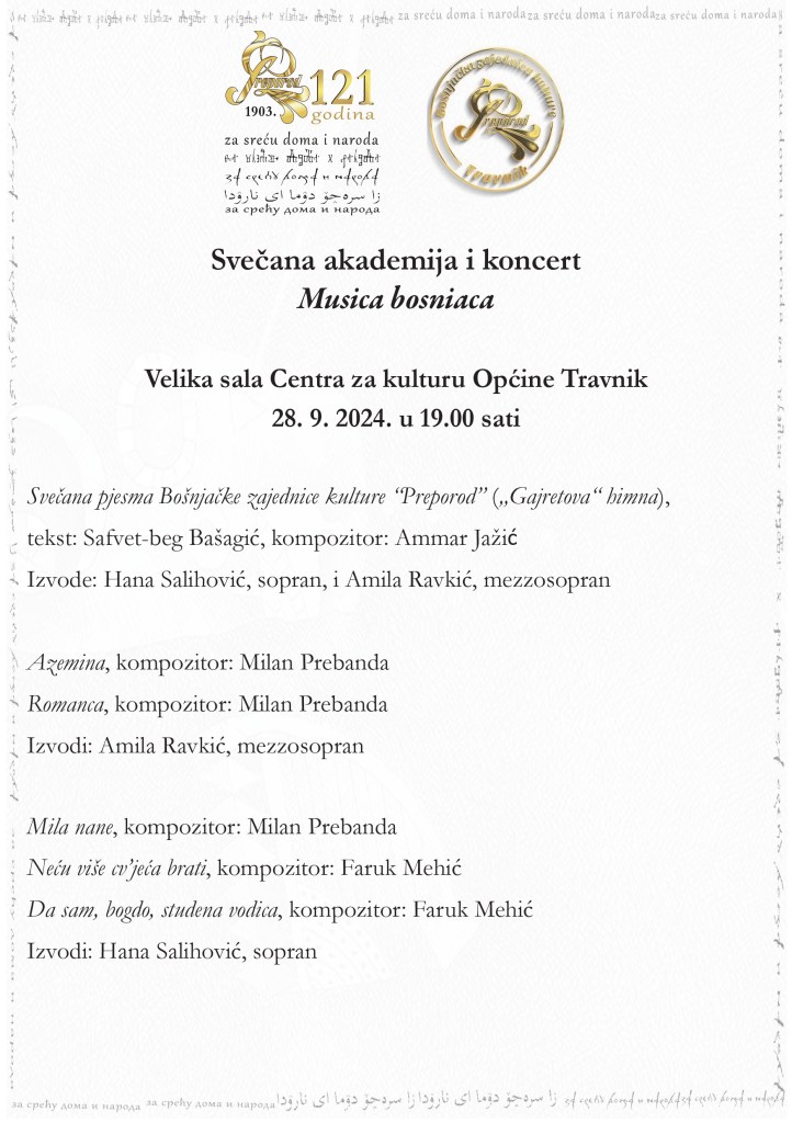 It is with great joy that I inform you that my compositions “Two folk romances” in the style of Bosnian folklore will be on the program of the concert “Bosniaca” at the BZK “Preporod” convention in Travnik. Many thanks to Hana Salihović and Bakir Samardžić for including my composition in the concert program, as well as the BZK “Preporod” and Sanjin Kodrić for organizing this convention! 😊🎼🎶🎵🎹🇧🇦