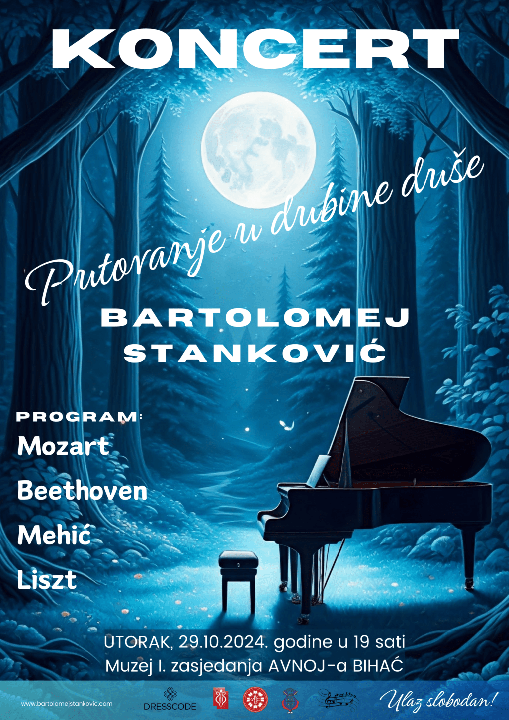 U saradnji sa JU Umjetnička škola “Nusret Keskin-Braco” Bihać, pijanist Bartolomej Stanković, profesor na Katedri za klavir Muzičke akademije Univerziteta u Istočnom Sarajevu, održat će koncert klasične muzike “Putovanje u dubine duše” u Bihaću.