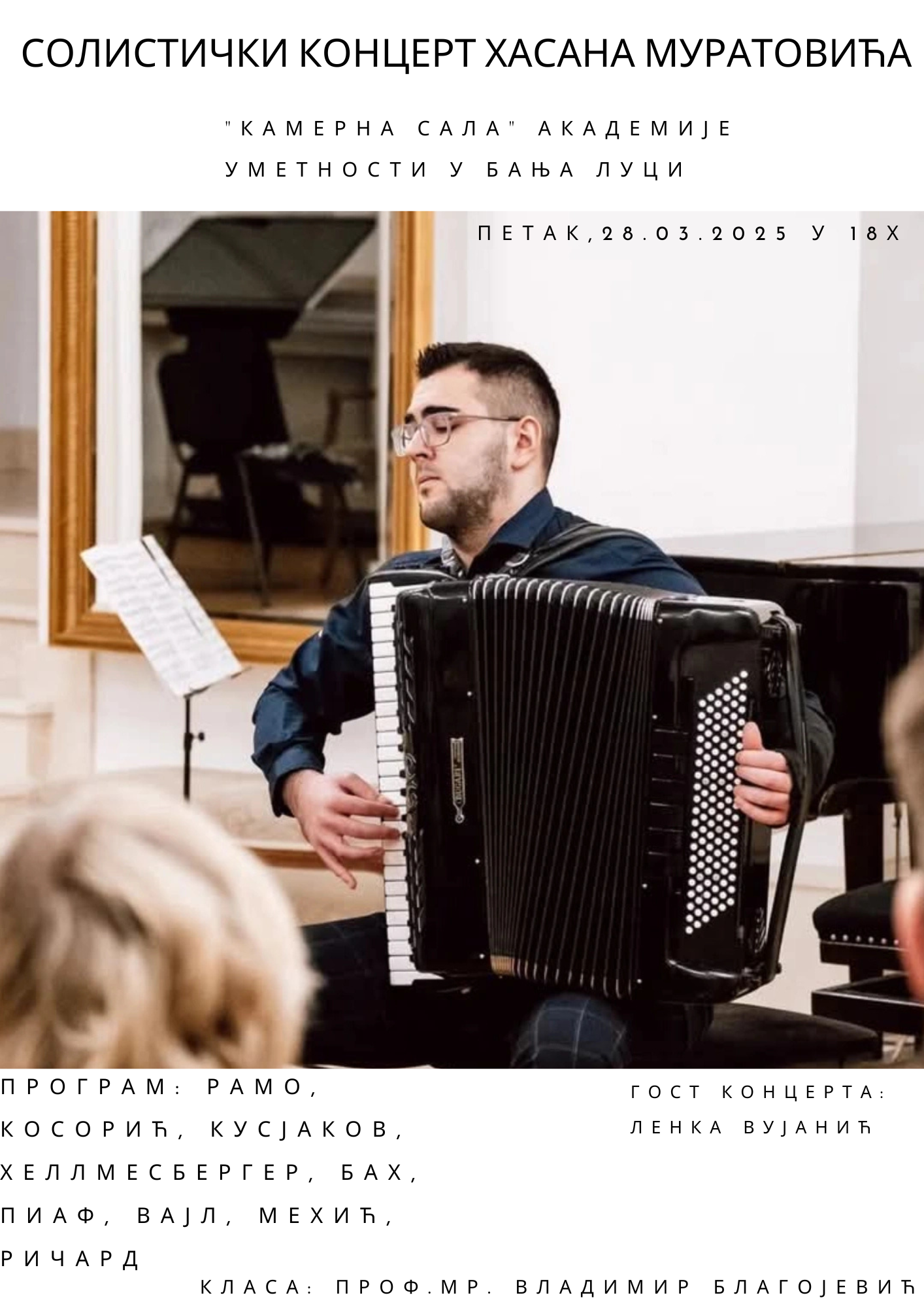 It is with great joy and excitement that I announce that my composition Study no. 3 op. 19 no. 3 for accordion solo, will have its world premiere at Hasan Muratović recital! The concert will be held on Friday (28.03) at 18:00 in the chamber hall of the Academy of Arts University of the University of Banja Luka. Come and enjoy the music 😊🎼🎶